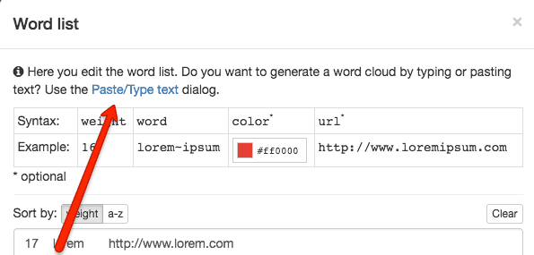 Step 2: Click “Word list”, then go to “Paste/Type text to paste in a big list of words you want to include in your design. Tip: the more words, the better the final result: